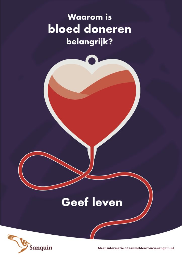 De poster moet als doel hebben om een positief gevoel te krijgen over bloeddonatie. Door de ondertitel ‘Geef leven’ op de poster te plaatsten geef je een positieve reden om bloed te doneren.